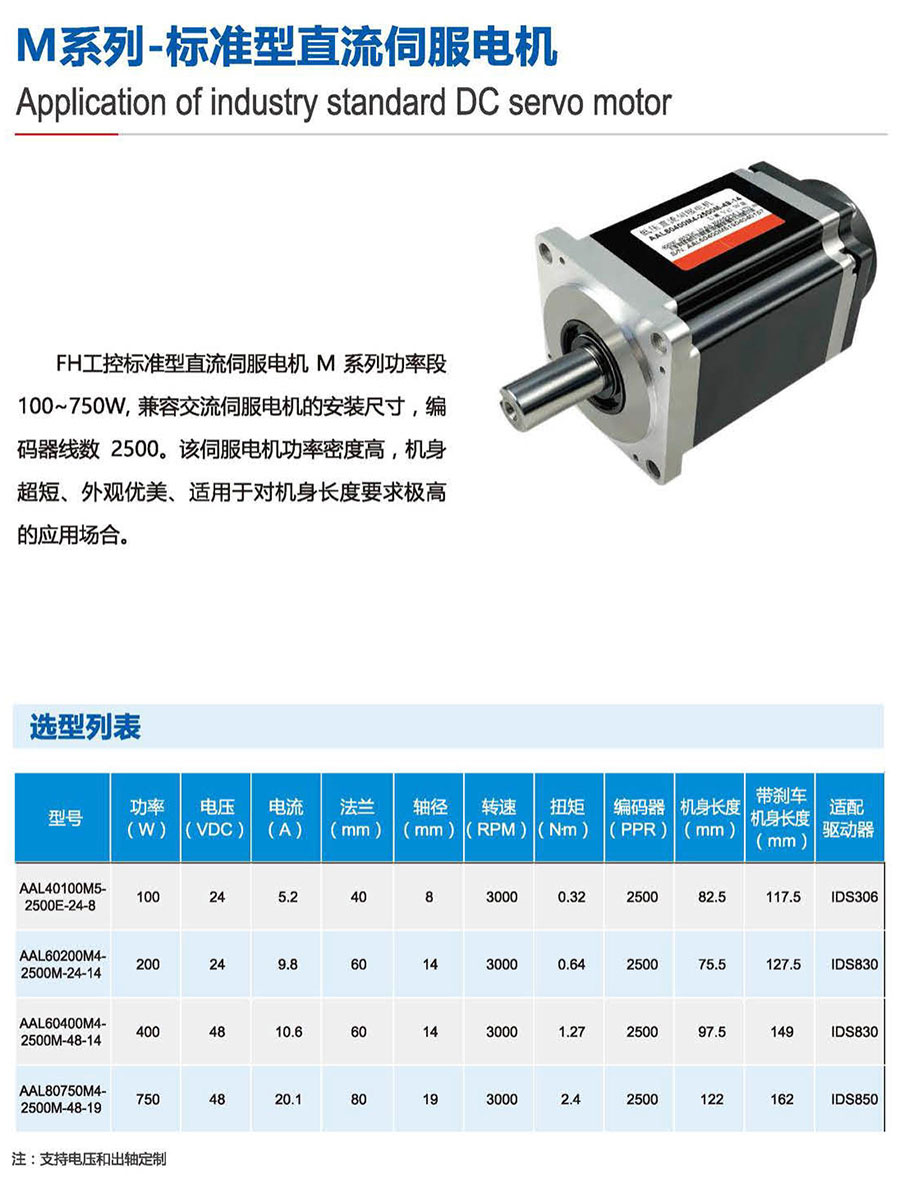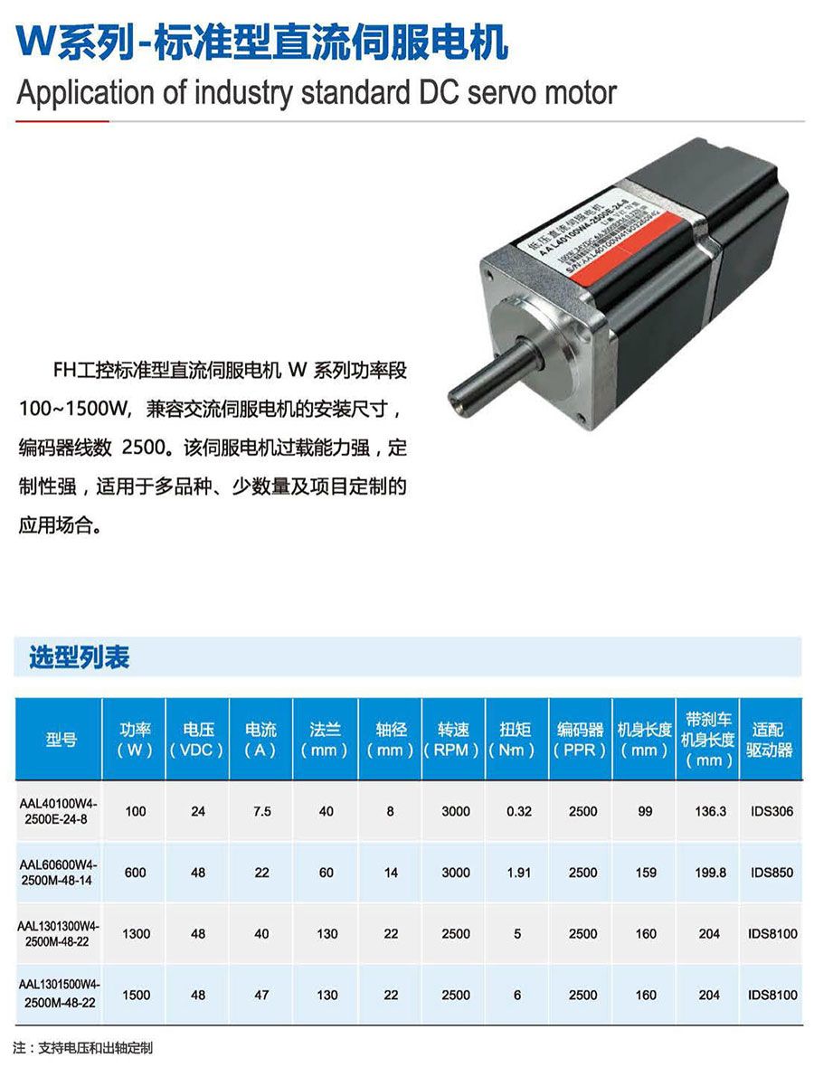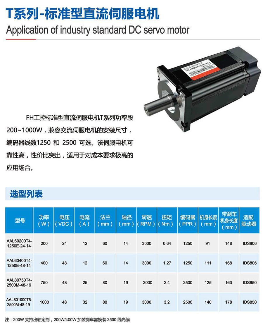 FH工控标准型直流伺服电机,功率段50~1500W,兼容交流伺服电机的安装尺寸,编码器线数1250和2500可选。该伺服运行平稳,低速性能突出,1RPM仍能平稳运行,额定电压下最高转速可达3800RPM,高于绝大多数国产伺服。该伺服采用低压直流24~72VDC供电,能够很好地适应国内用电环境良莠不齐的状况,避免电压大幅波动或跌落对伺服驱动电路的冲击,有利于提升设备寿命,更加贴近国际低压使用标准,安全性更高。该伺服技术成熟,装调简单,稳定可靠,性价比超高,是众多自动化厂商伺服部分降成本的最佳选择。